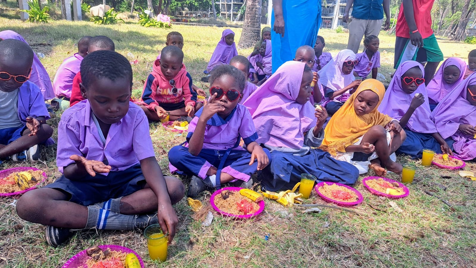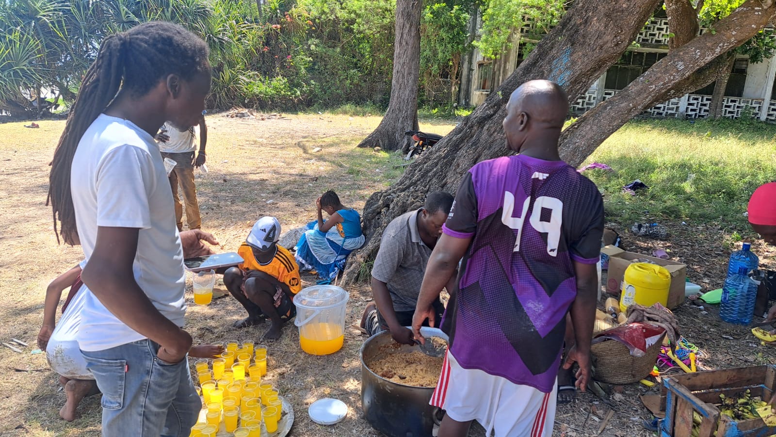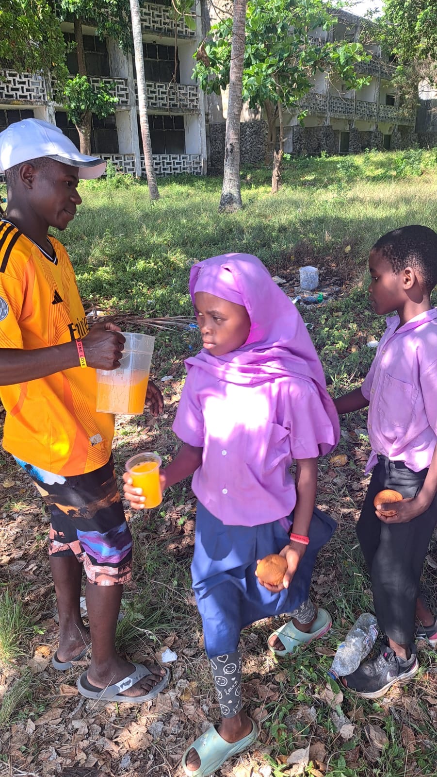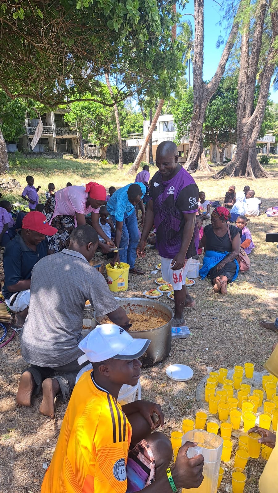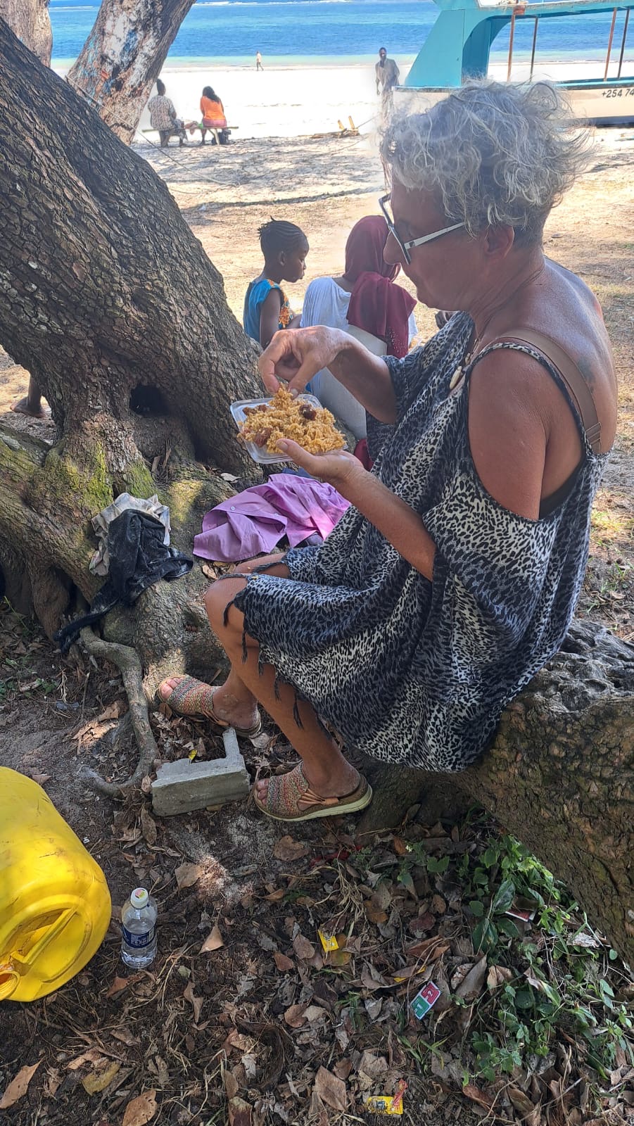 Nach dem Baden, ein paar sportlichen Übungen und viel Gelächter war Essen angesagt. Dank meiner Freundin Christine gab es wieder reichlich Pilao, Bananen und Saft – Dinge, die sich eine kenianische Familie sonst kaum leisten kann. Bonbons durften natürlich auch nicht fehlen, und wie ordentlich die „Lütten“ in der Reihe standen – da hätten sich manche Erwachsene eine Scheibe abschneiden können.