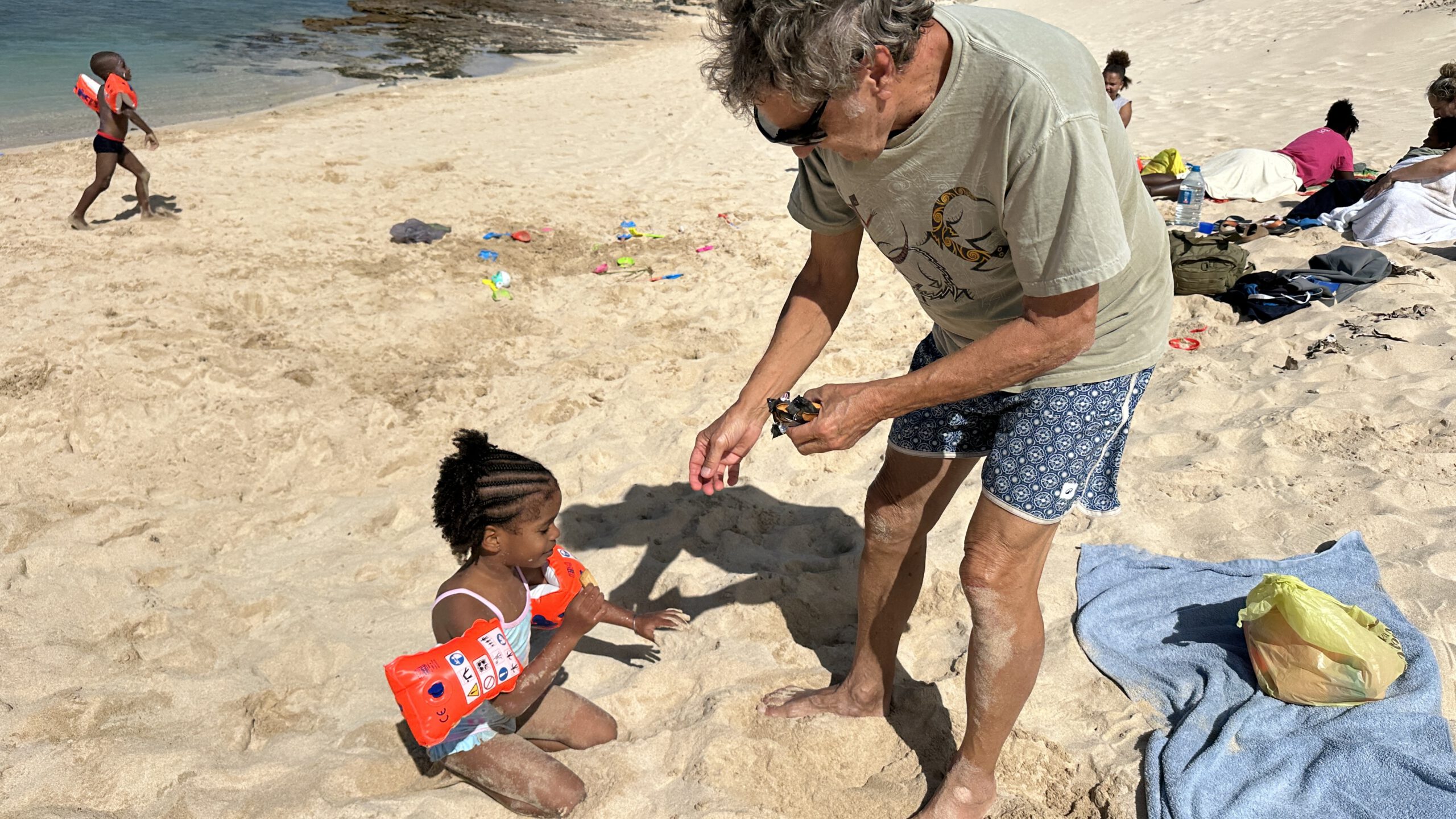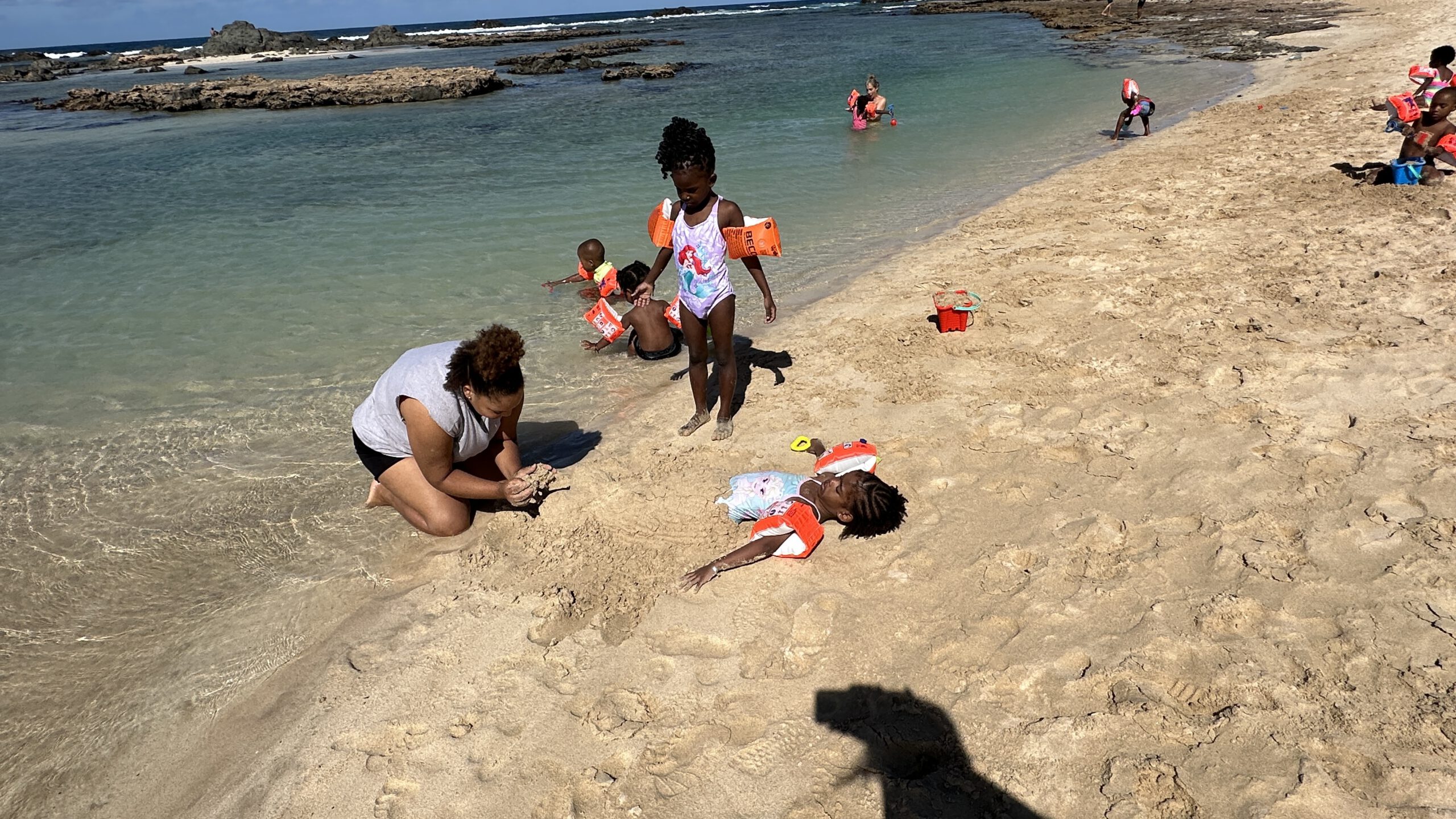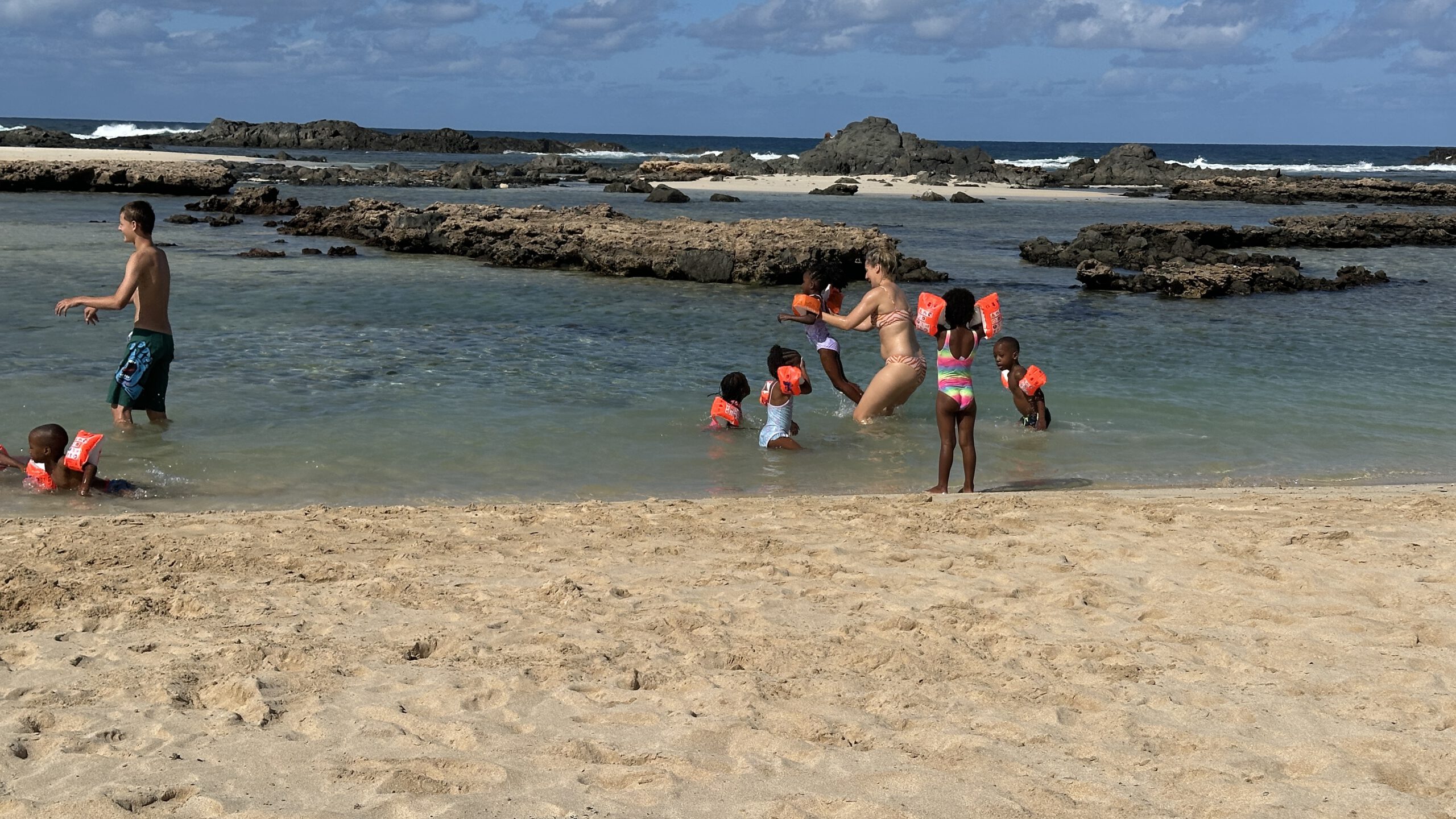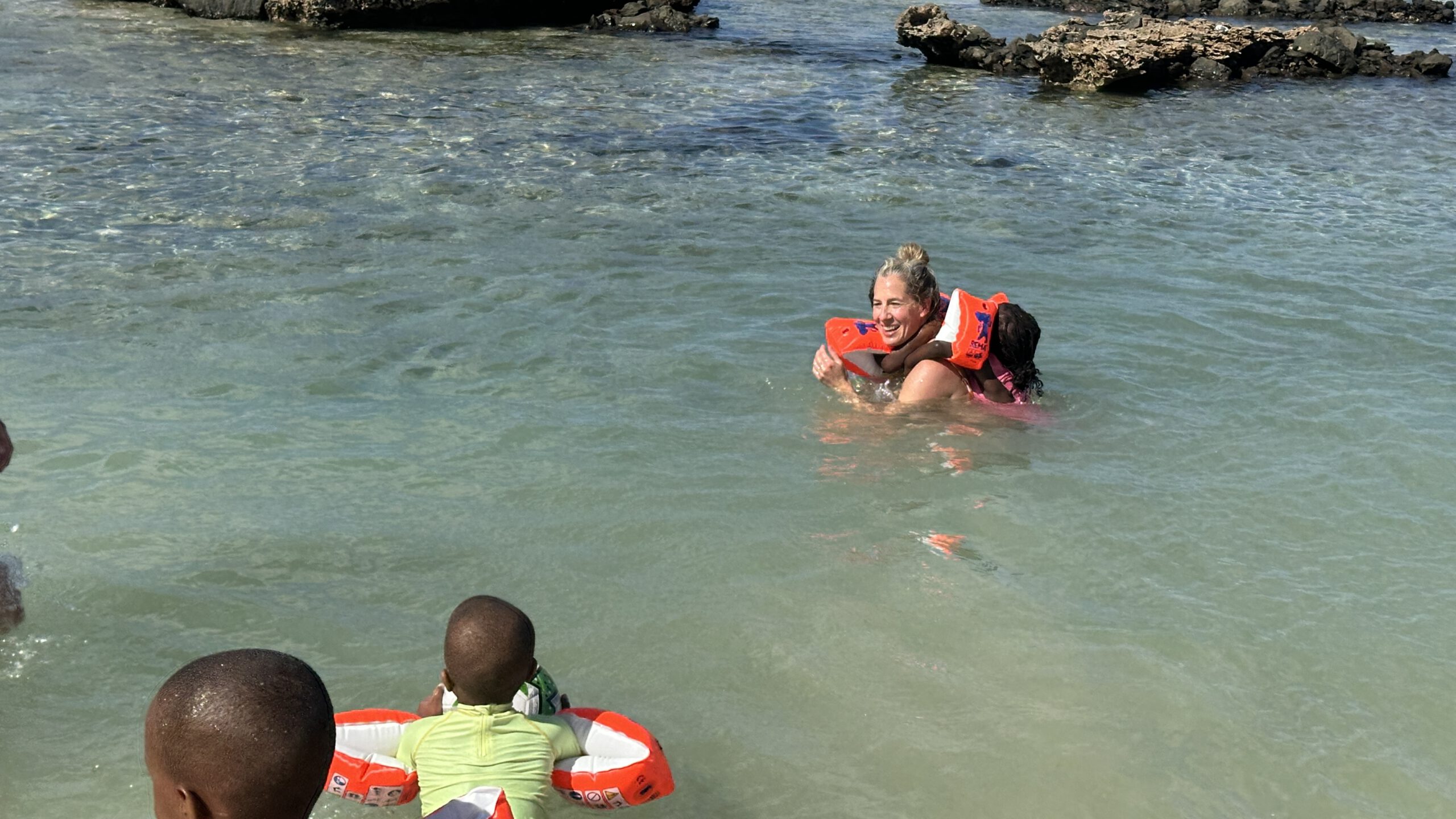 Saskia hatte fleißig Schwimmflügel gesammelt, also ging es mit einigen Kindern ab ins Meer. Ergebnis: Niemand geht mehr unter!